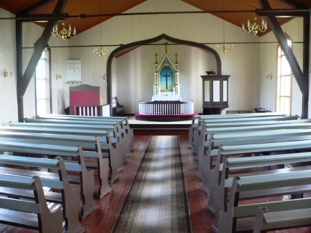 kapell. I 1938 vart det påbygd. Preikestolen og døypefonten er frå det året og vart laga av Olav Flakstad.